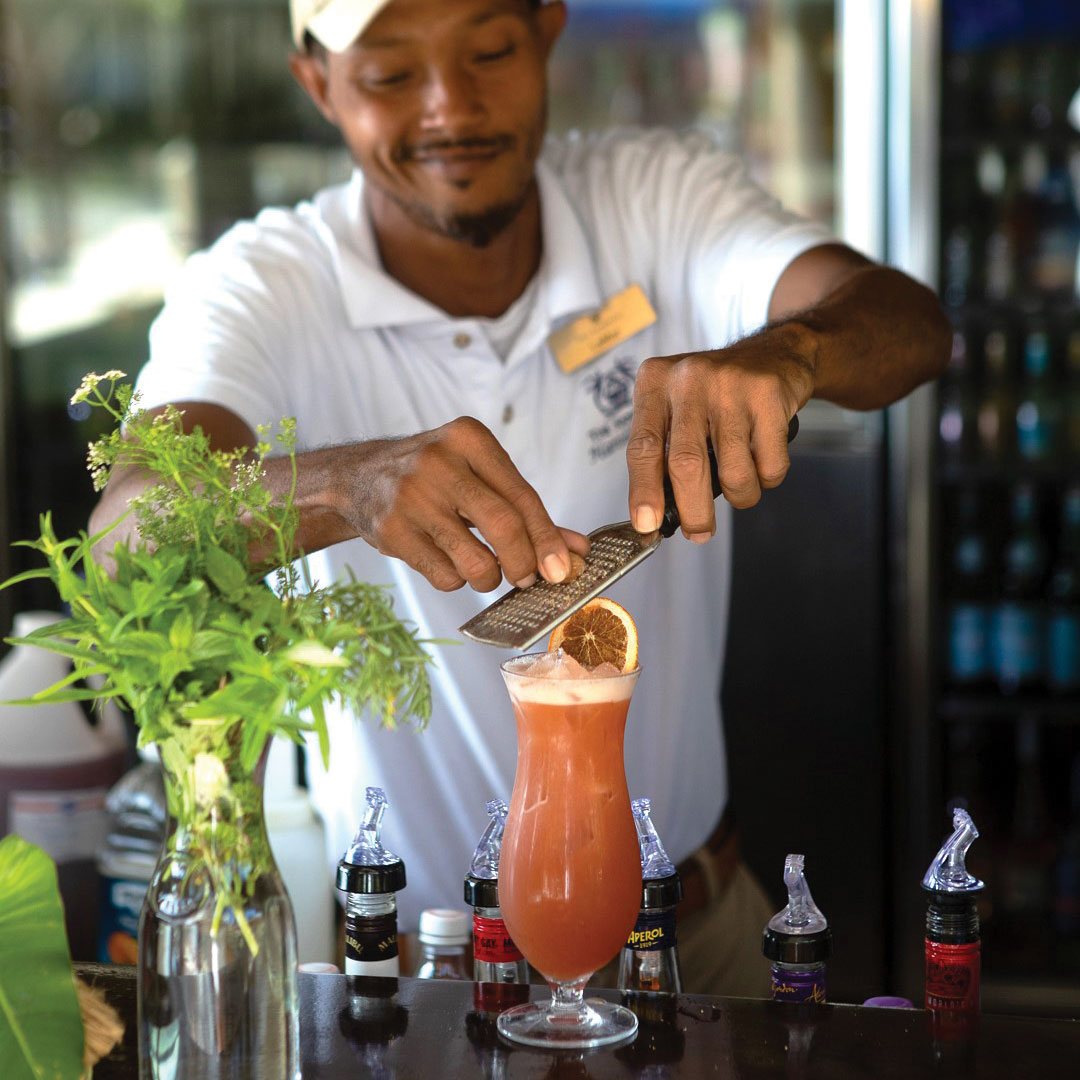 In an elegant outdoor dining area, executive chef Spencer Kells curates a daily menu using the freshest local ingredients, complemented by seasonal international produce to create an internationally influenced but still locally based fusion cuisine.